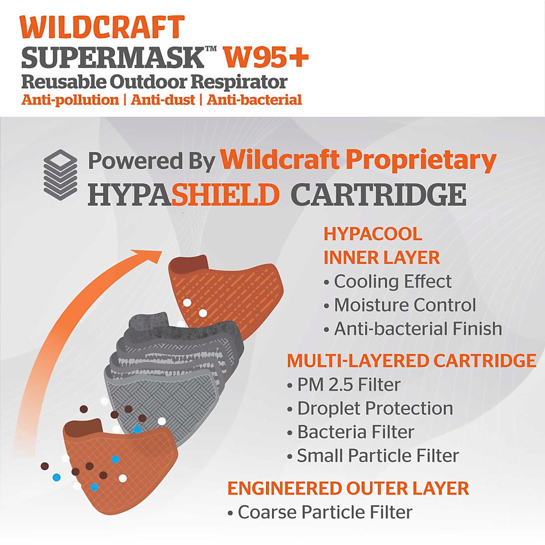 SUPER MASK W95+ is a reusable outdoor respirator that comes with enhanced protection, comfort, and an upgraded design. Powered by Wildcraft Proprietary Cartridge, SUPER MASK W95+ is your perfect outdoor companion. Carefully designed for all weather conditions keeping breathability and comfort in mind, SUPER MASK W95+ reusable outdoor respirator keeps you safe from dangerous microbes, pollutants, dust, particulate matter, smoke from vehicle exhausts, factories, bushfires, etc. SUPER MASK W95+ comes with a Flexi-fit neck strap for easy handling and long-hour wearing comfort.